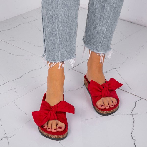 - Wygodne klapki w kolorze czerwonym wykonane z ekologicznego zamszu. Pasek ozdobiony efektowną kokardką. Idealne na długie spacery. Świetnie obuwie damskie, które wkomponuje się w każdą letnią stylizację!