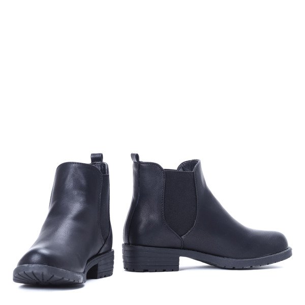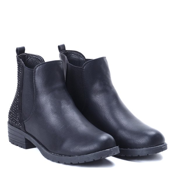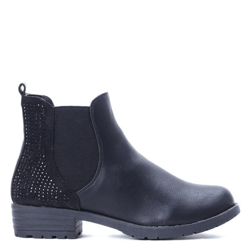 • Czarne damskie botki wykonane z eko-skóry, tył z eko zamszu. Buty posiadają ozdobne dżety w tylnej części. Obuwie na grubej podeszwie. Pasują do wielu stylizacji.