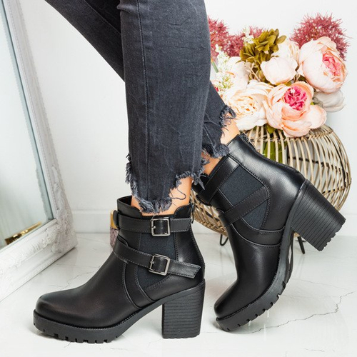 • Damskie botki na słupku wykonane ze skóry ekologicznej. Model w kolorze czarnym. Obuwie posiada zapięcie na suwak w tylnej części. Te buty damskie będą idealnym dodatkiem na jesień.