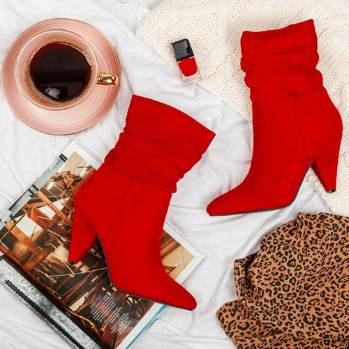 - Czerwone botki na charakterystycznym trójkątnym obcasie. Cholewka wykonana ze skóry ekologicznej zamszowej. Model ze spiczastym noskiem, zapinany suwakiem po boku. Buty delikatnie ocieplane pinką pokrytą tkaniną. Idealny dodatek do jesiennych kreacji!