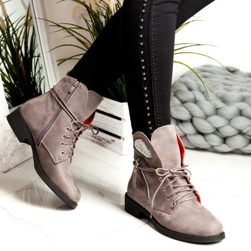 • Damskie botki na niskim płaskim obcasie wykonane z eko-zamszu. Model w kolorze szarym. W środku ocieplenie w formie futerka. Cholewka wiązana sznurówkami, po boku ozdobny suwak. Workery posiadają ozdobne cyrkonie w górnej części.