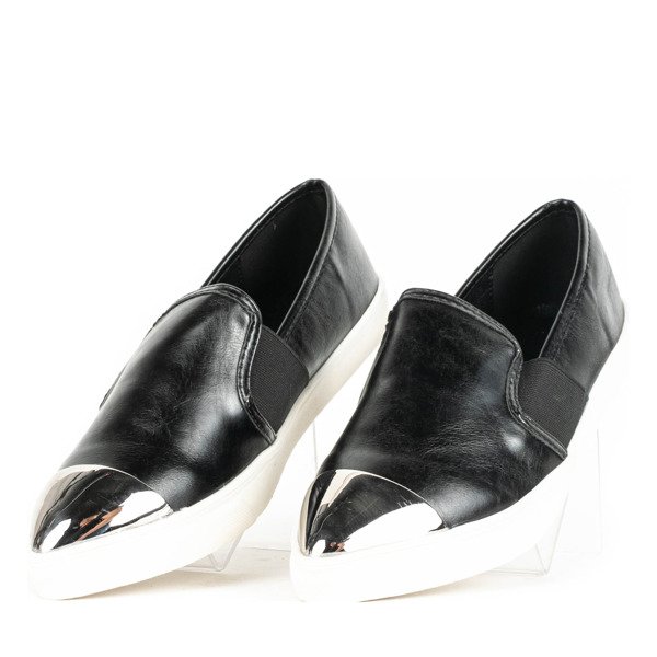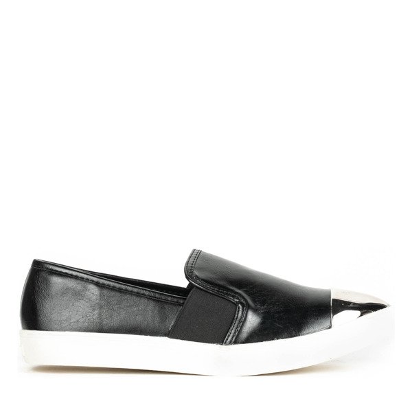 • Unikalne slip on z metalicznym noskiem typu szpic wykonane z ekologicznej skóry w kolorze czarnym. Model posiada eko-skórzaną wkładkę. Buty gwarantują wygodę na co dzień i nie ograniczają ruchu stopy. Pasują do jeansów!