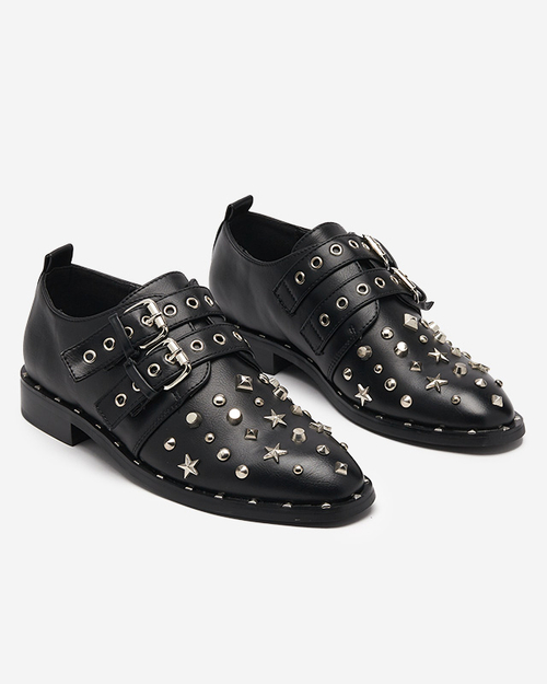 - Czarne półbuty na niskim obcasie wykonane ze skóry ekologicznej. Model zdobiony srebrnymi ozdobami. Buty damskie zapinane sprzączkami. Wpasują się świetnie do jeansów.