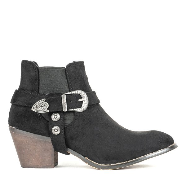 - Fekete csizma a'la cowboy csizma alacsony oszlopon, ökológiai velúr bőrből. Csúsztatható modell - nincs rögzítve. Dekoratív csat az oldalán. A női cipők nem rendelkeznek további szigeteléssel. MEGJEGYZÉS: a sarkak kissé eltérő árnyalattal rendelkezhetnek.