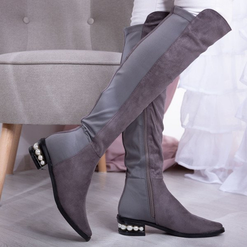 - Damskie szare kozaki za kolano wykonane z ekologicznego zamszu. Tylna część posiada wstawki z elastycznego materiału. Płaski obcas zdobiony perełkami. W środku delikatnie ocieplane futerkiem.