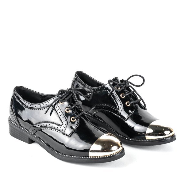 - Gustowne damskie półbuty na płaskim obcasie ze złotym noskiem. Wykonane ze skóry ekologicznej lakierowanej. Cholewka sznurowana. Podeszwa posiada metaliczne wykończenie.