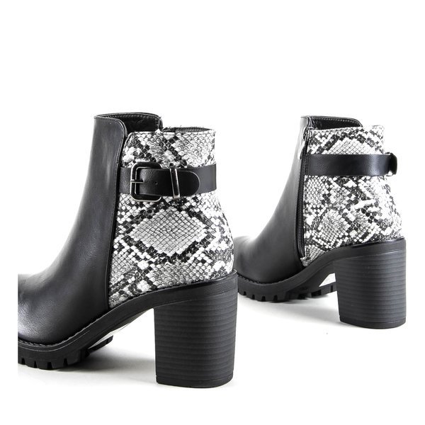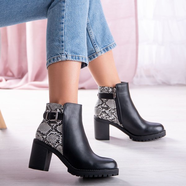 - Eleganckie botki na wysokim słupku. Materiał wykonania to eko-skóra w czarnym kolorze. Tylna część cholewki imituje skórę węża. Zapięcie na zamek po wewnętrznej stronie.