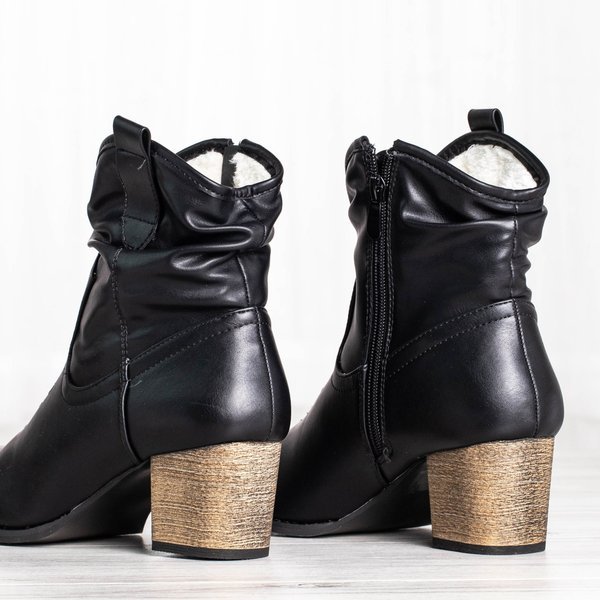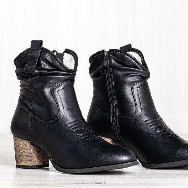 - Niesamowicie wygodne damskie botki typu kowbojki na drewnianym słupku. Cholewka wykonana ze skóry ekologicznej w kolorze czarnym. W środku posiadają ocieplenie w formie futerka. Z boku zapinane są na suwak. Doskonale się sprawdzą chłodniejsze dni!
