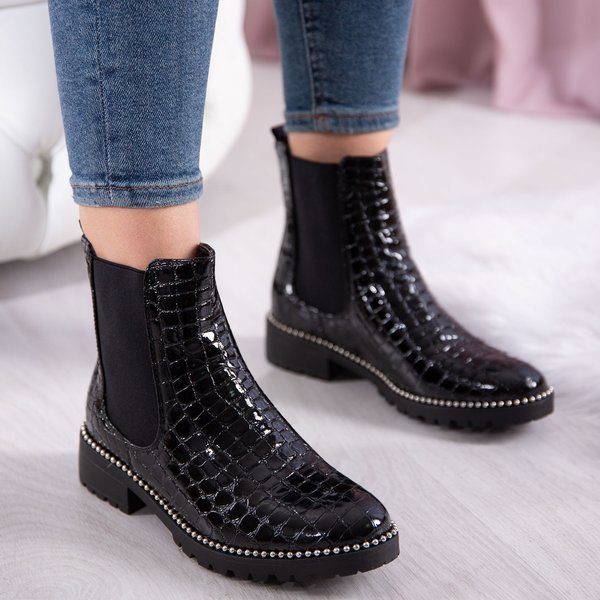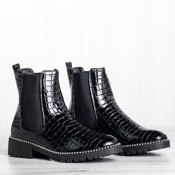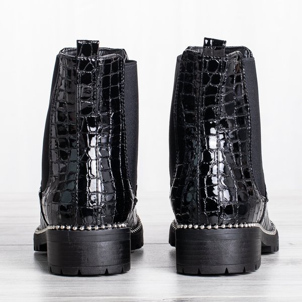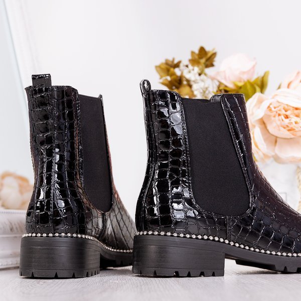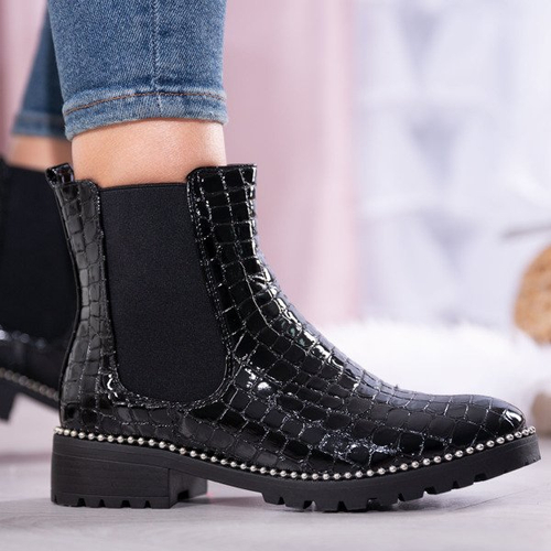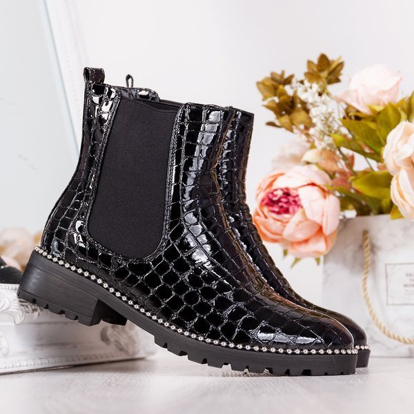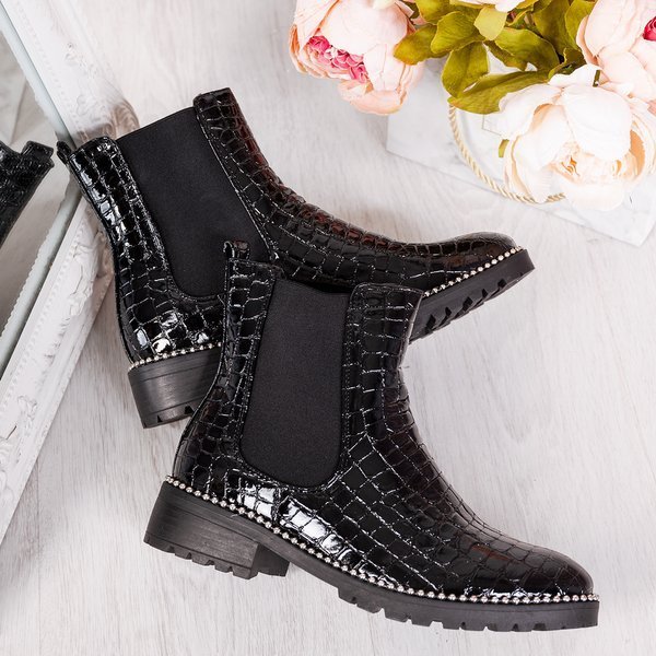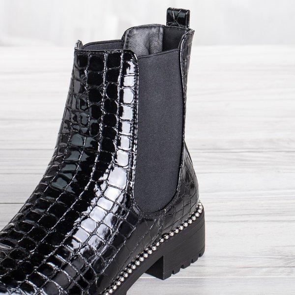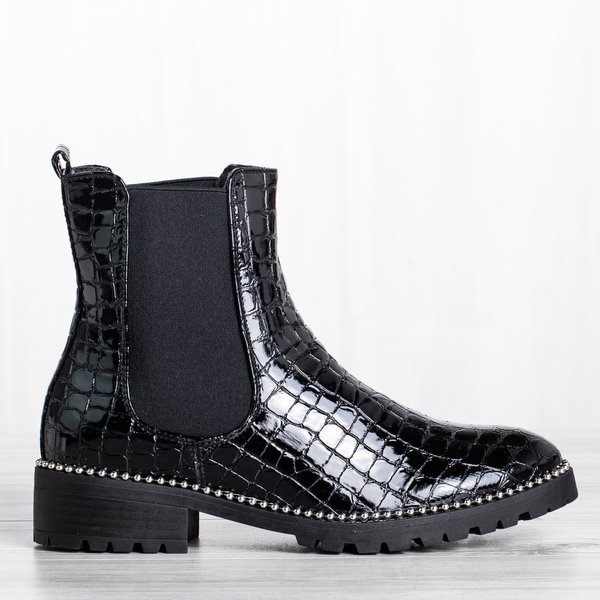 - Stylowe damskie botki na płaskim obcasie w kolorze czarnym. Cholewka wykonana z lakierowanej skóry ekologicznej ze zwierzęcym tłoczeniem. W środku posiadają delikatne ocieplenie w formie futerka. Podeszwa zdobiona srebrnymi koralikami.