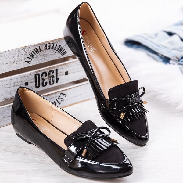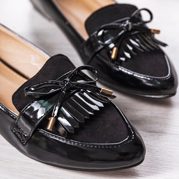 • Eleganckie mokasyny na płaskim obcasie. Model wykonany z lakierowanej eko-skóry oraz eko-zamszu. Nosek zdobiony frędzelkami i kokardką. Klasyczny fason, który sprawdzi się zarówno do jeansów jak i do garniturowych spodni.
