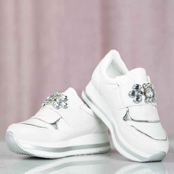 • Zapinane na rzepy damskie buty sportowe na platformie, wykonane z eko-skóry w kolorze białym. Model zdobiony kryształkami. Doskonale sprawdzą się na co dzień.