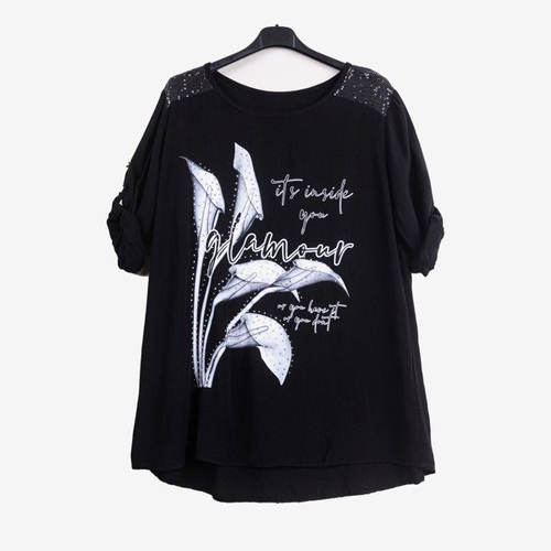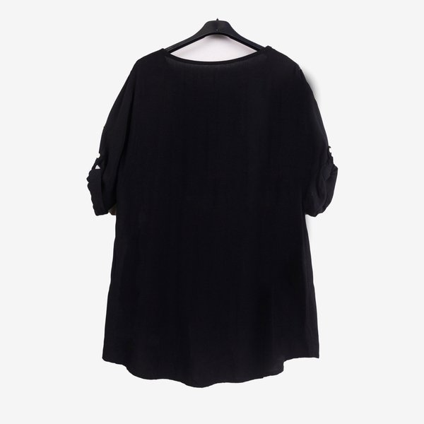- Női viszkózból készült túlméretes tunika. Az ujjak gombos rögzítéssel rendelkeznek. A modellt virágmintával, feliratokkal és cirkónia díszíti. MEGJEGYZÉS: Mérési pontosság (+/-) 1 cm.