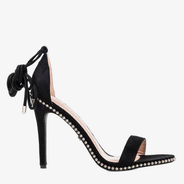 - Női fekete szandál, magas sarkú, ökológiai velúr bőrből. A talpbetét ekológikus bőrből készül. Bokamagasságban madzaggal kötött modell. A cipő élei ezüst strasszokkal díszítve. Megjegyzés: a terméknek törött anyaga van.