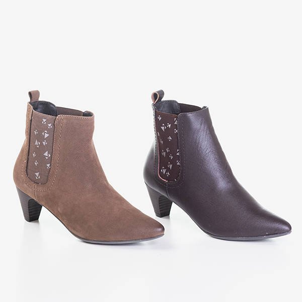 - Damskie botki na niskim słupku wykonane ze skóry ekologicznej - matowej. Rozciągliwe gumy na bokach cholewki są zdobione geometrycznymi wzorkami. Wkładka pokryta eko - zamszem, nosek jest spiczasty. Nowoczesne buty na jesień!