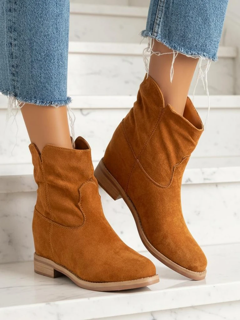 Cowboy stílusú bokacsizmák alacsony éktalppal, ökológiai velúrbőrből készültek. A cipők belebújósak és belül puha szőrme formájában béleltek. Nagyszerű kiegészítői lesznek a mindennapi öltözékeknek.