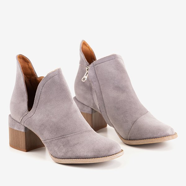 - Divatos női csizma kivágással egy alacsony oszlopon. A felső része öko-velúrból készült, szürke színű, a betétet szövet borítja. A modell belül cipzárral van rögzítve. Tökéletesen illeszkedik a mindennapi stílusokhoz!