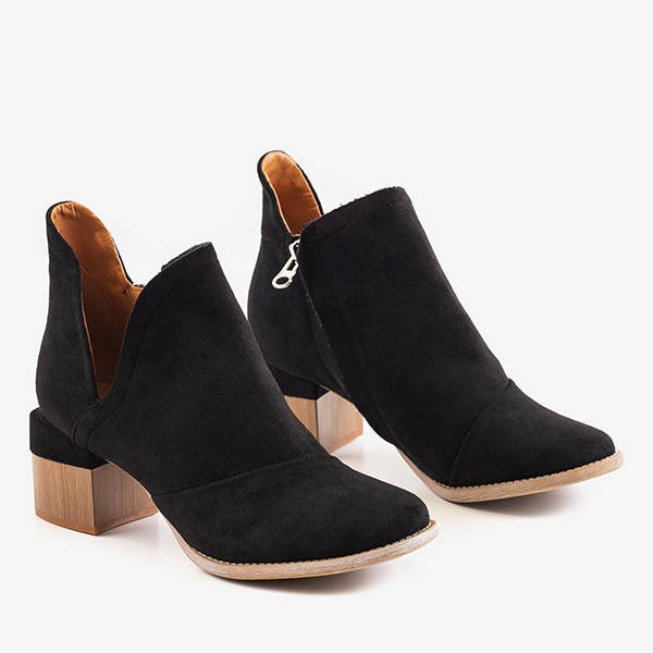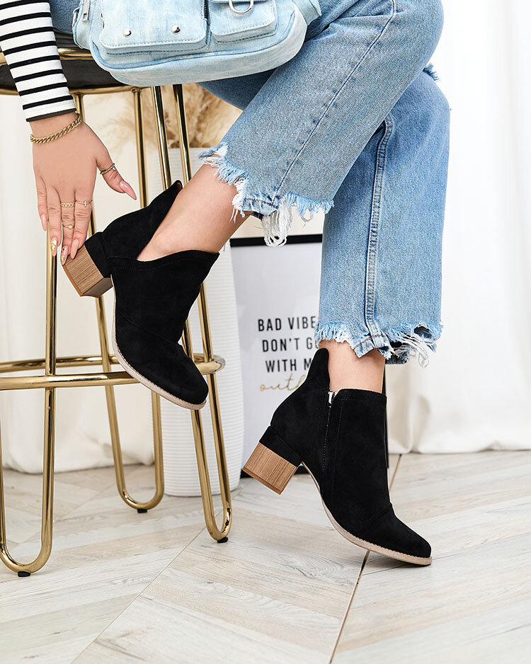 • Divatos női bokacsizma kivágásokkal az alsó oszlopon. A szár fekete színű öko-velúrból készült, a talpbetét szövet borítja. A modell belső oldalán cipzárral van rögzítve. Tökéletesen illeszkedik a mindennapi stílusokhoz!
