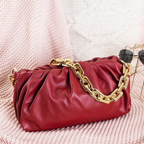 - Az idei év legdivatosabb kézitáska, ökológiai bőrből és fodrokkal. A táska madzagon vagy arany láncon viselhető. Fém rögzítőlemezzel rögzítve - a végek egymás felé tolásával nyílik.