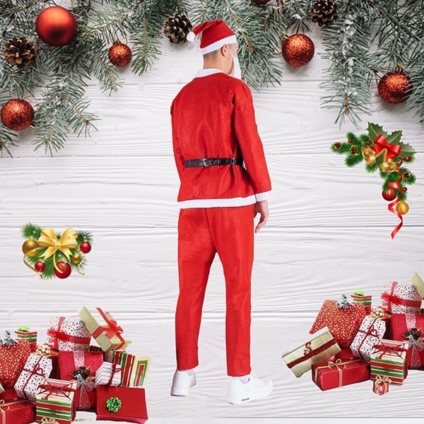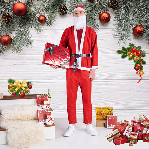- Férfi St. Nicholas, vörös szövetből. A készlet tartalma: pulóver, nadrág - nadrággal, sapkás sapka és pompom, szakáll és öv csattal. MEGJEGYZÉS: Mérési pontosság (+/-) 1 cm.