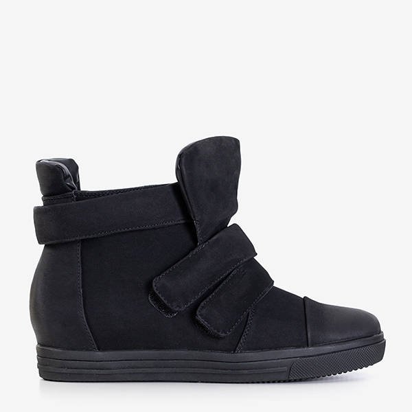 - Fekete női tornacipő beltéri ékkel, öko-nubuk bőrből. Lábujj viasz díszítéssel. A modellnek nincs kapcsa - csúsztatható. A cipő belseje szőrrel van szigetelve, míg a talpbetét nemezből készült.