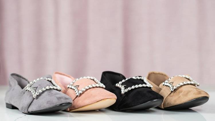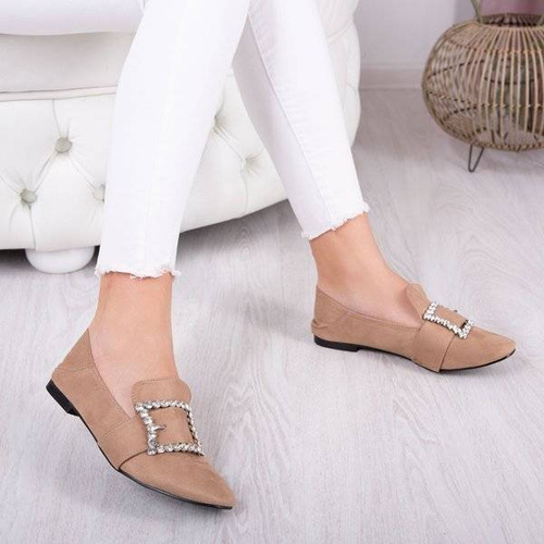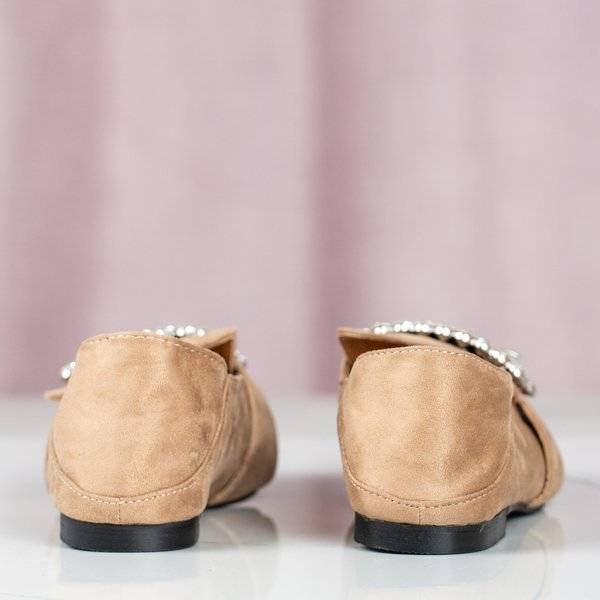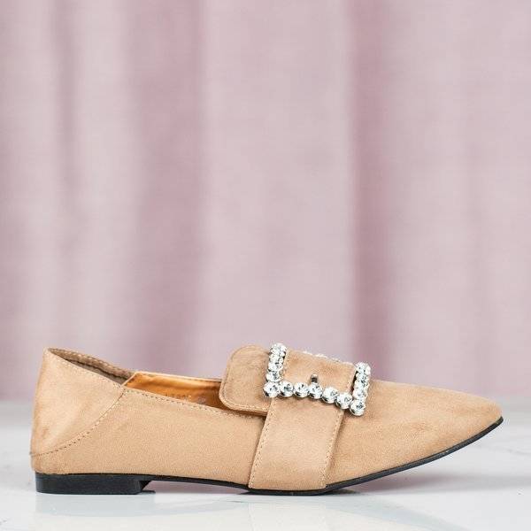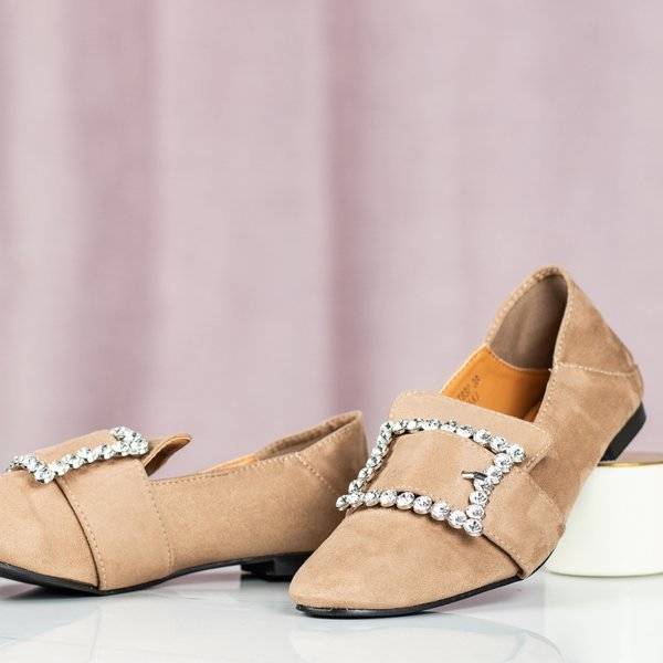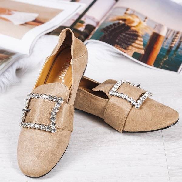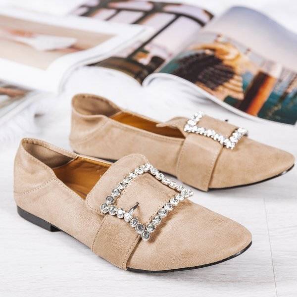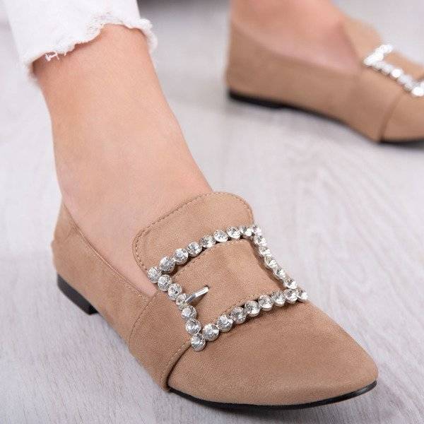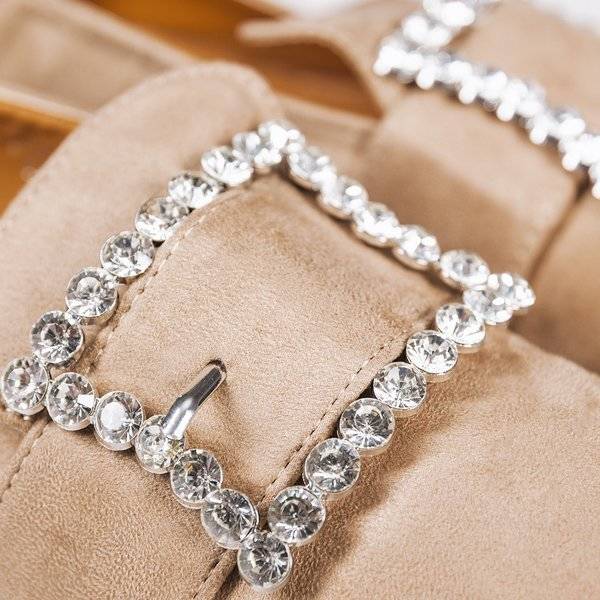 - Klasszikus női cipők lapos sarokkal. - barna öko-velúr bőrből. A lábujjat kavicsokkal szegélyezett csattal ellátott öv díszíti. A sarokszámláló nincs megmerevítve. Megjegyzés: Néhány dísz hiányzik a termékből.