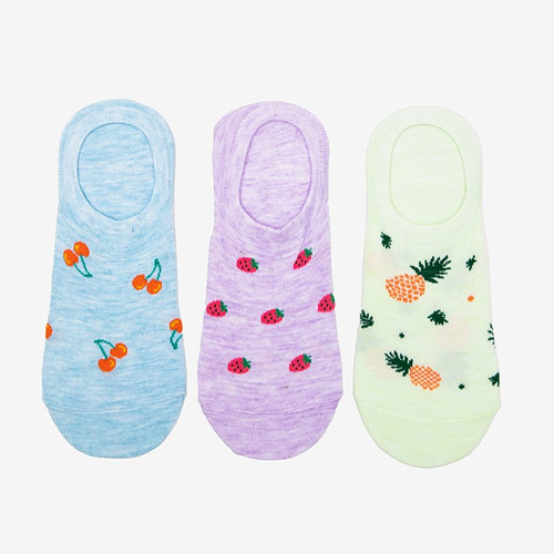 - Színes női zokni, pamut anyagból, a következő színekben: lila, zöld és kék. A modellt gyümölcsnyomattal díszítik. Ezek a zoknik nagyszerűek mindennapi használatra.