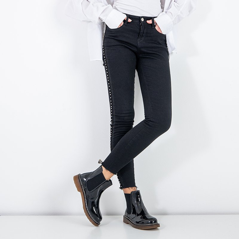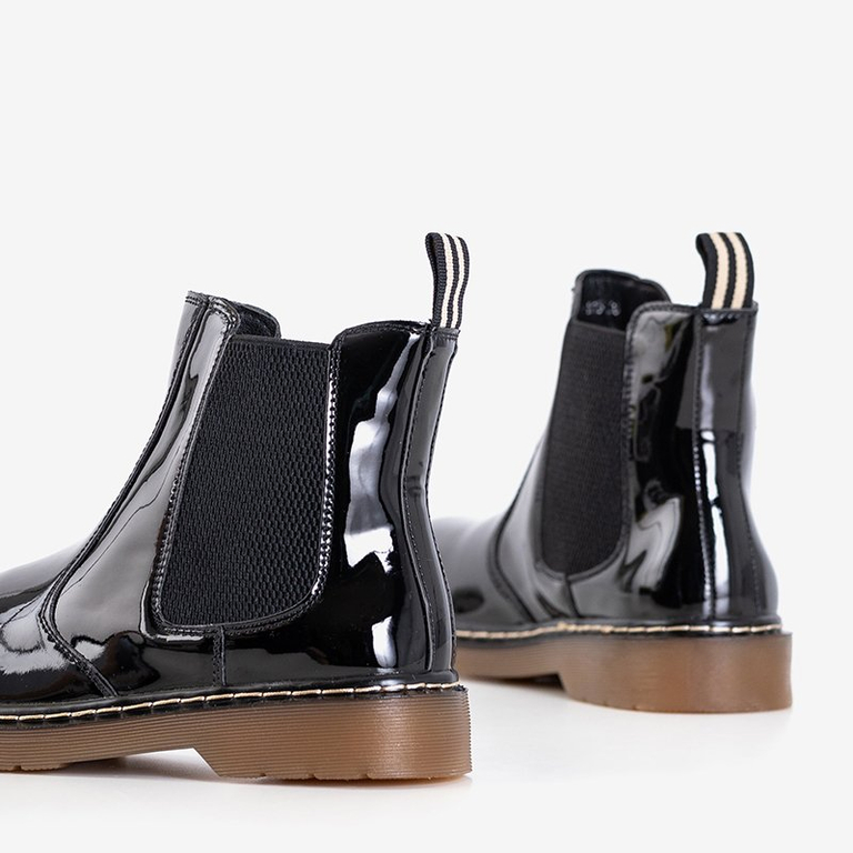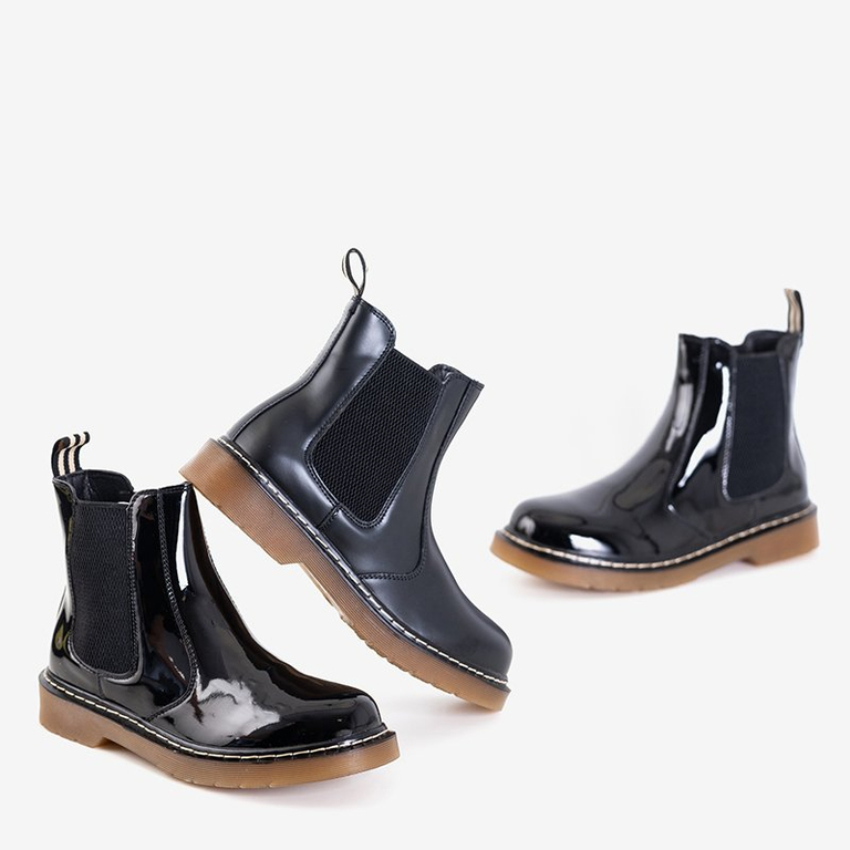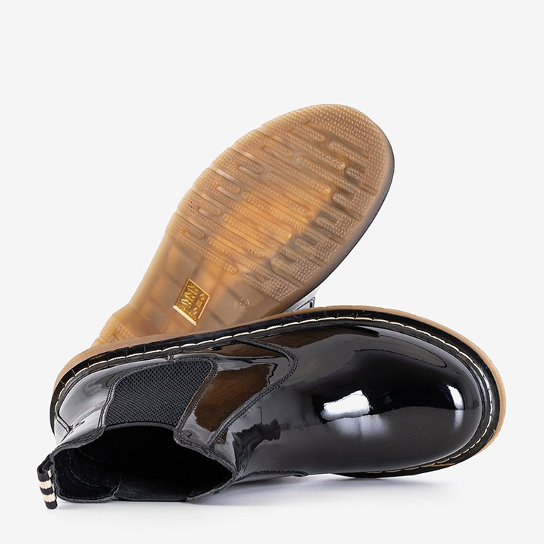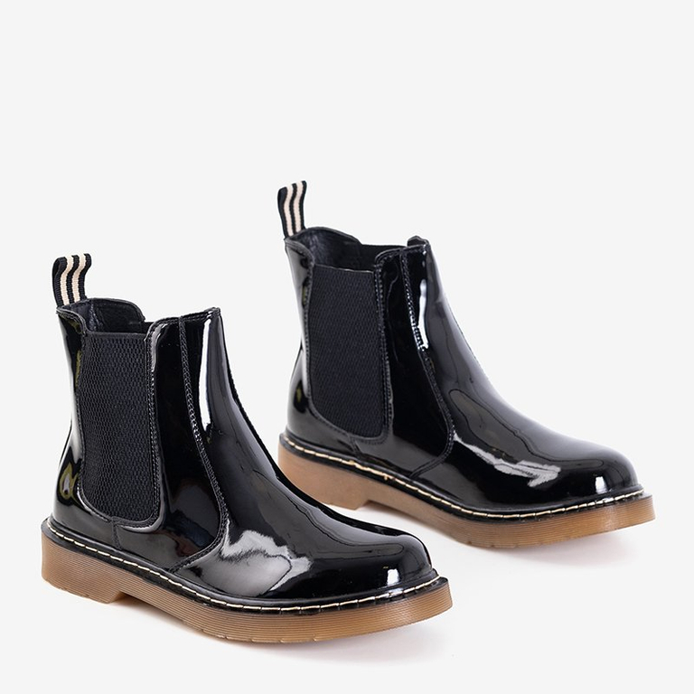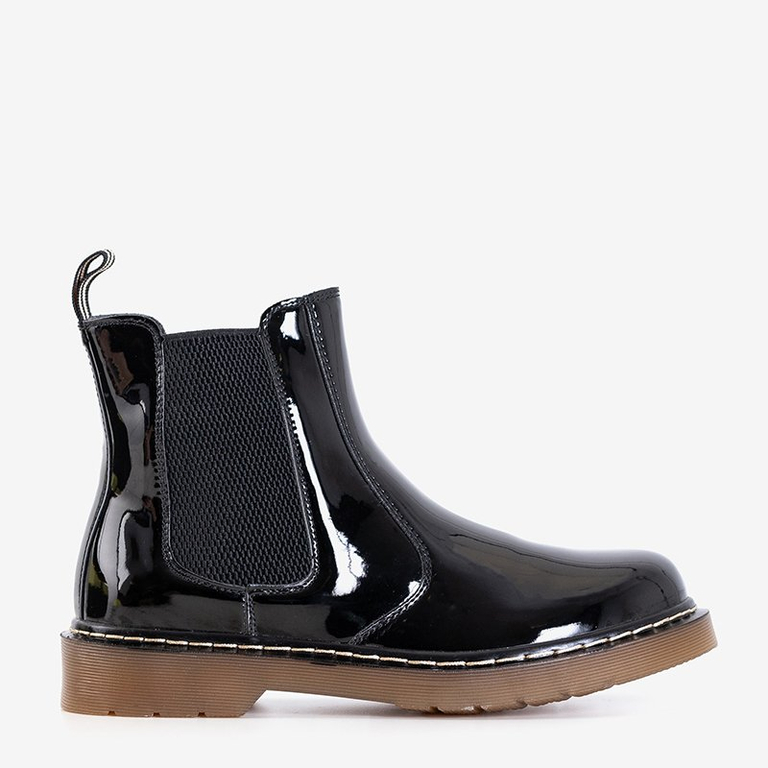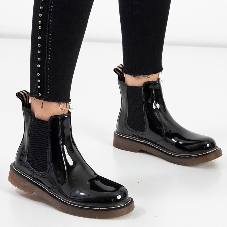 • Fekete női csizma lakkozott, ökológiai bőrből. A belső betét anyaggal van bélelve. Rugalmas betétek az oldalakon. Tökéletes női cipő hidegebb napokra!