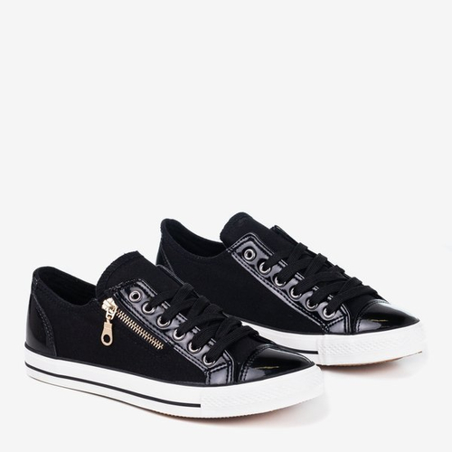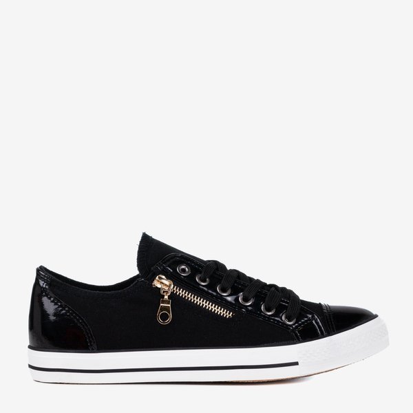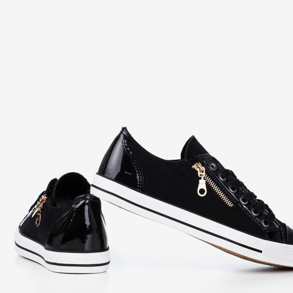 - Női cipők fekete anyagból készült gumitalpú. A cipők lakkozott betétekkel rendelkeznek. Fűzős modell kívül dekoratív arany cipzárral. Megjegyzés: a termék elszíneződött az anyagon.