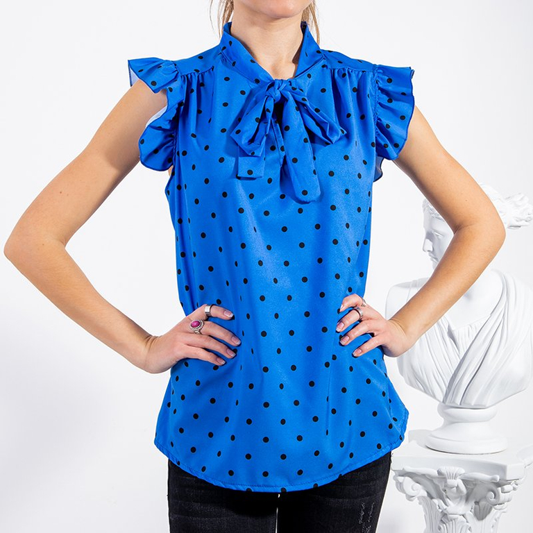 - Elegáns női blúz könnyű és puha szövetből, pöttyös nyomtatással. Rövid ujjú, kötött nyakkivágással és aszimmetrikus szegéllyel rendelkező modell. Tökéletes mind nadrághoz, mind szoknyához! MEGJEGYZÉS: Mérési pontosság (+/-) 1 cm.