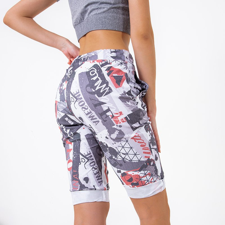 - Női rövid, térdig érő nadrág, viszkózszövetből, színes nyomtatással. Rugalmas szalaggal és derékon kötött zsinórokkal ellátott modell, két csúszó zsebbel. Tökéletes mindennapi használatra! MEGJEGYZÉS: Mérési pontosság (+/-) 1 cm.