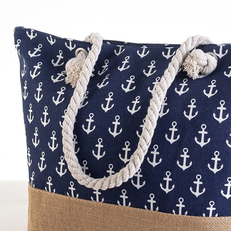 • Stílusos női strandtáska, textilanyagból, horgonynyomással befejezve. Két vastag fogantyúval ellátott modell, erős kötélből. Belül egy rekesz kiegészítő zsebek nélkül, cipzárral rögzítve.