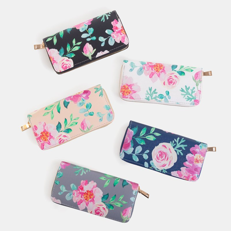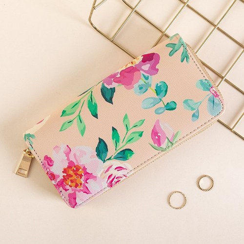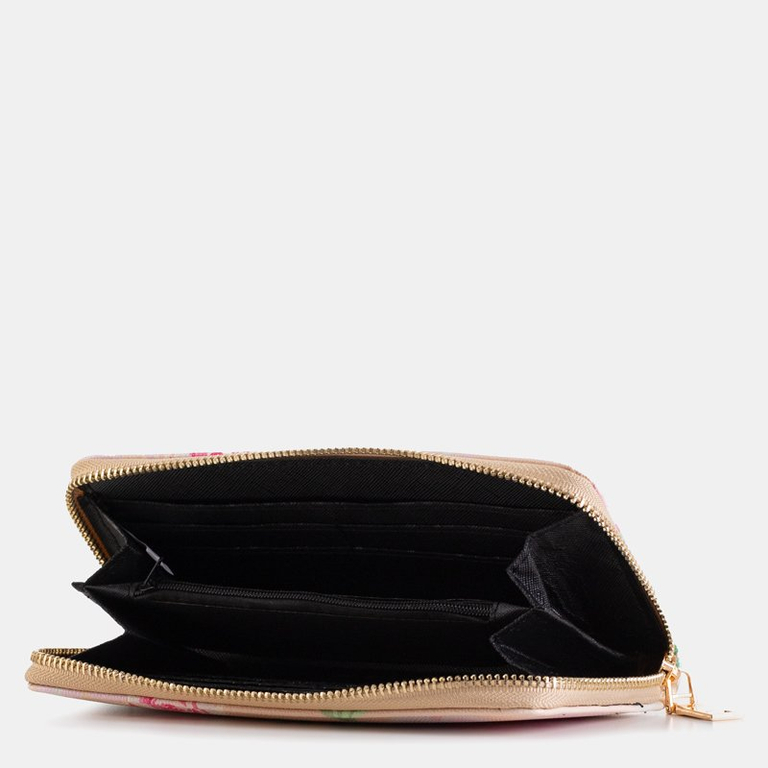 - Virágmintás női pénztárca, ökológiai bőrből és cipzárral rögzítve. A modell a következőket tartalmazza: - 2 rekesz, köztük 1 rejtett zsebbel, - 10 zseb, ebből 8 kisebb, fizetőkártyák vagy egyéb dokumentumok tárolására.