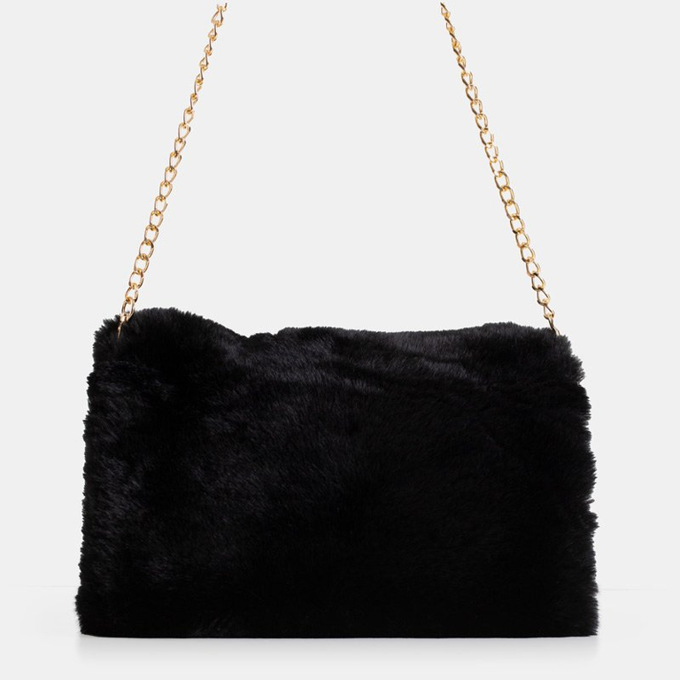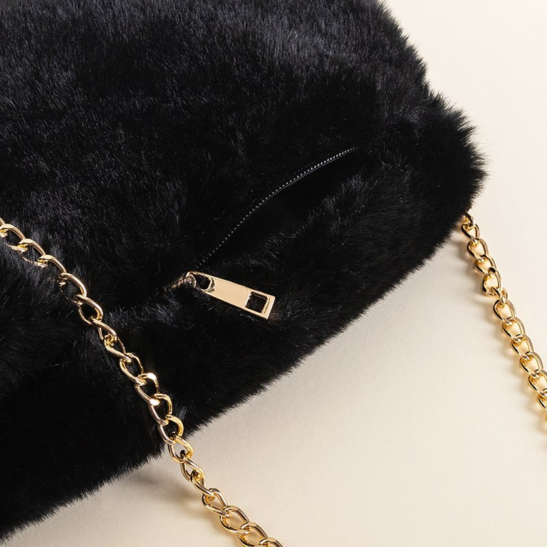 - Puha női kézitáska szintetikus szőrmével és cipzárral rögzítve. A készlet egy arany láncot tartalmaz, amelyet homárcsattal rögzítenek. Egy rekesz belül, további zsebek nélkül. Tökéletes esti ruhákhoz!