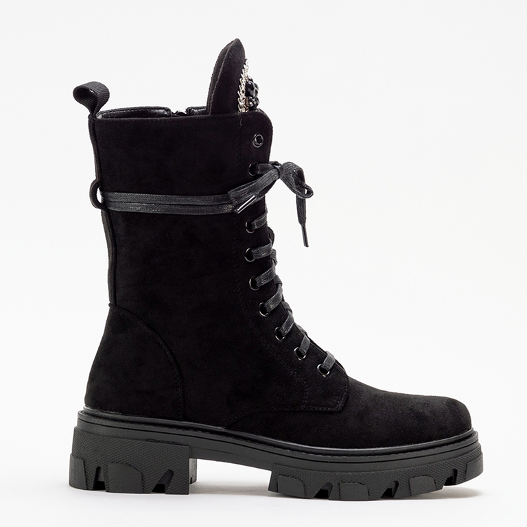 - Magas női öko-velúr csizma, fűzve és cipzárral rögzítve. Ezen kívül dekoratív kavicsok a nyelven. Modell magasabb talpon, belül szövet. Tökéletes választás egy hidegebb időre!