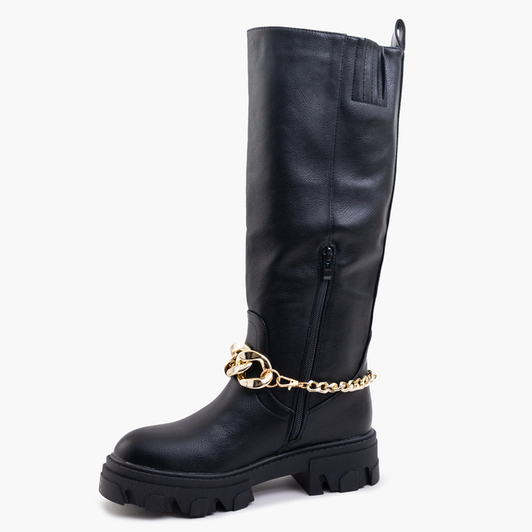 • Klasszikus női térdig érő, természetes bőrből készült csizma. Bokamagasságban a modellt levehető szíj díszíti, arany színű műanyag lánccal. A cipő cipzárral rögzíthető, a belseje finom szőrme formájában melegít.
