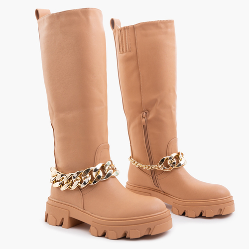 - Klasszikus női térdig érő, természetes bőrből készült csizma. Bokamagasságban a modellt levehető szíj díszíti, arany színű műanyag lánccal. A cipő cipzárral rögzíthető, a belseje finom szőrme formájában melegít.