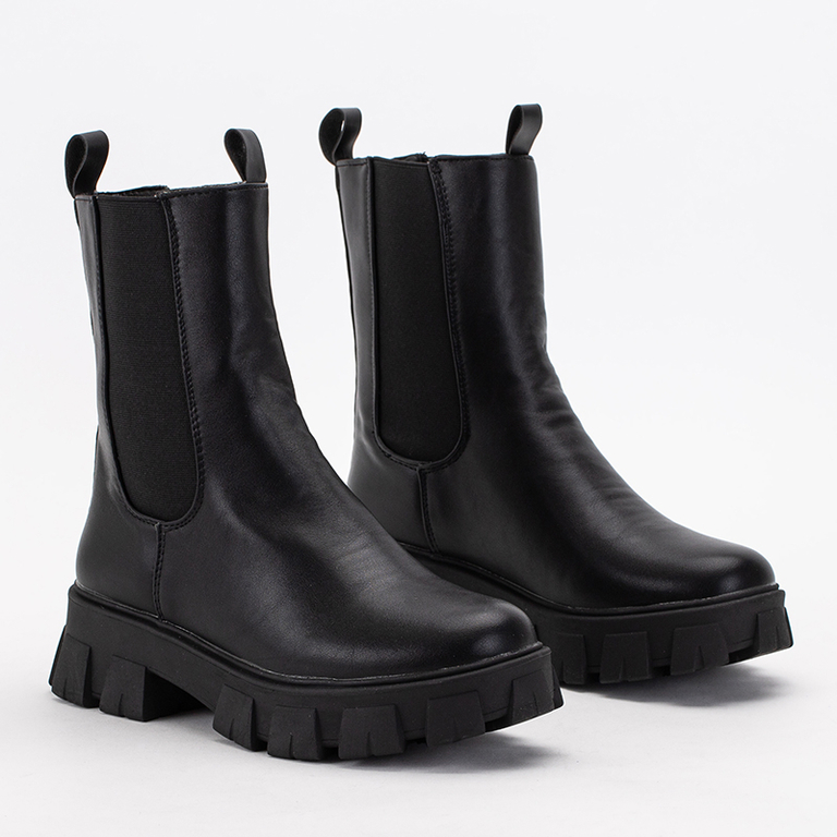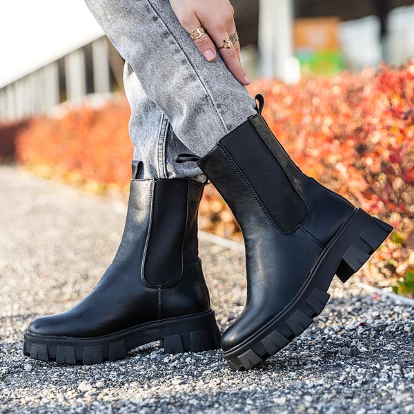 • Fekete munkáscsizma vastag talppal. A modell eko bőrből készült, szövet talpbetét. A cipők felső részén elasztikus betétek vannak.