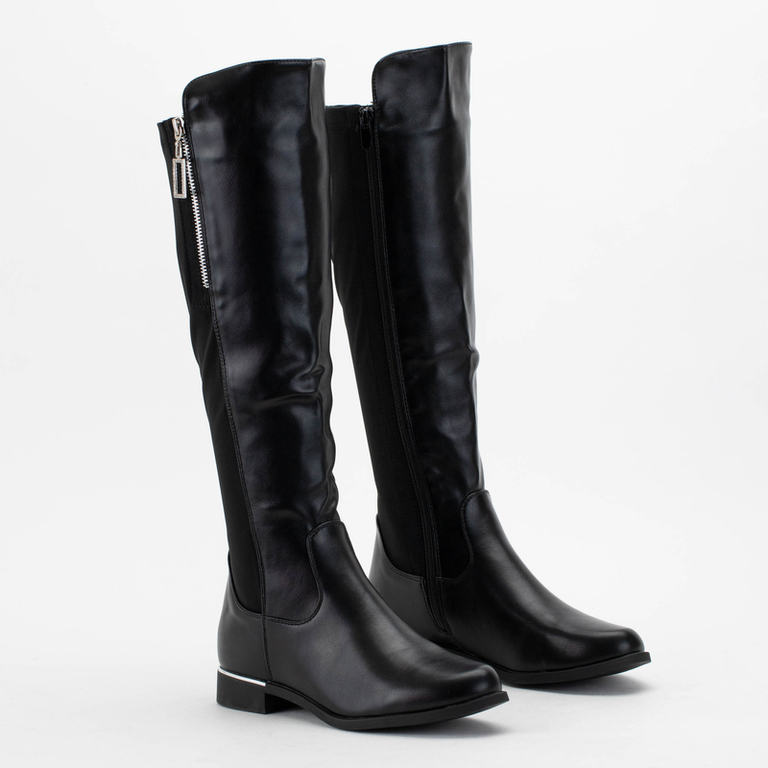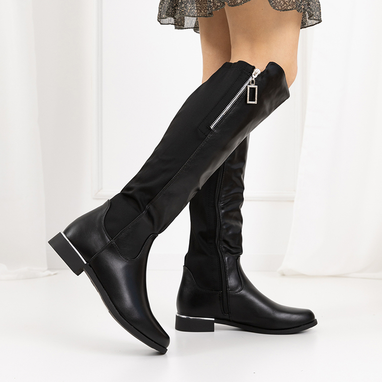 • Fekete ökobőr a térdcsizma felett. A cipő hátulja rugalmas anyagból készült. Szigetelt modell, cipzárral a borjú közepéig. Lapos cipő. Klasszikus és elegáns!