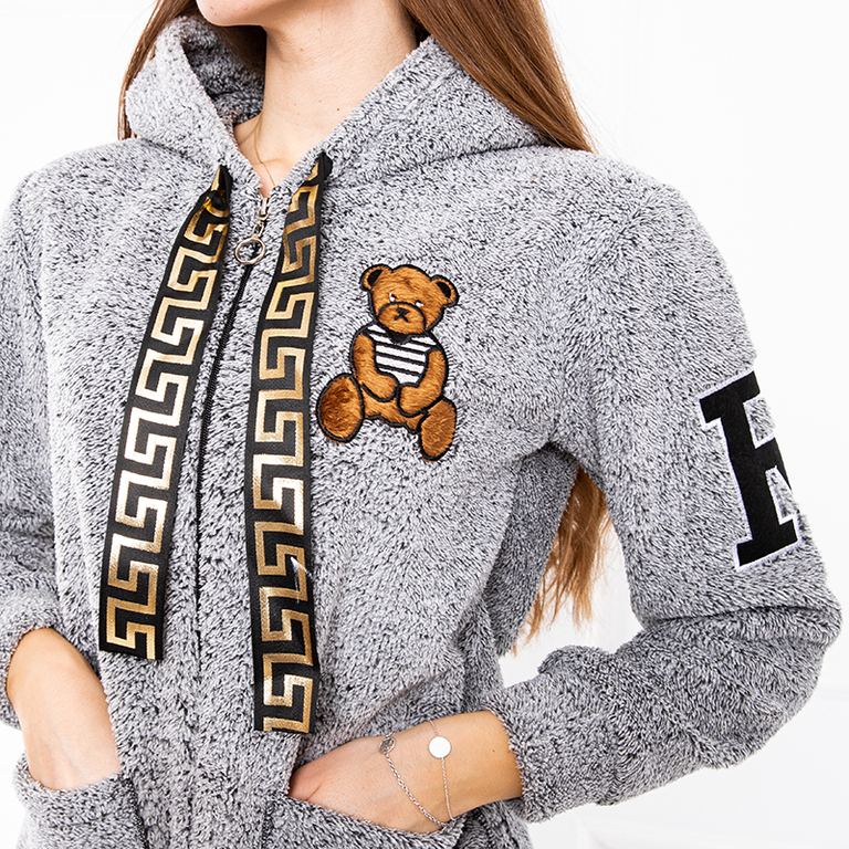 Női szürke plüss cipzáras kapucnis pulcsi mackófoltokkal - Ruházat