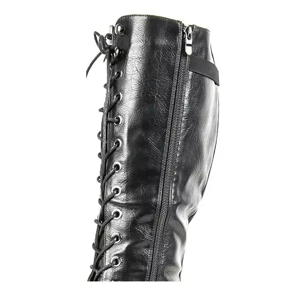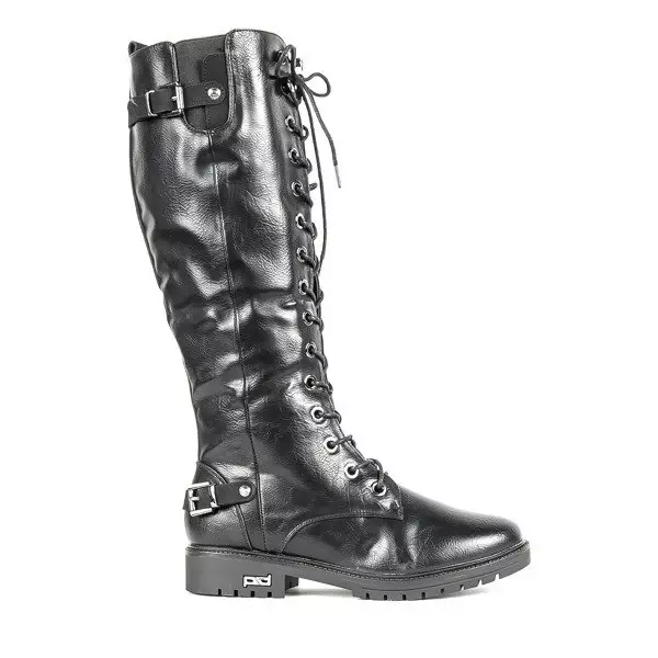 - Fekete öko bőrből készült lapos sarkú csizma. A lábbeli belseje kellemes tapintású szőrrel van szigetelve. A cipő cipzárral és fűzővel rendelkezik. Remek kiegészítői lesznek a gardróbodnak hideg napokra.