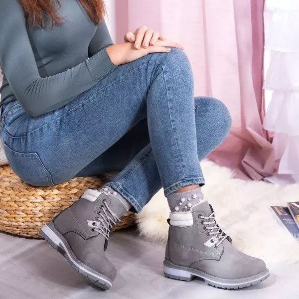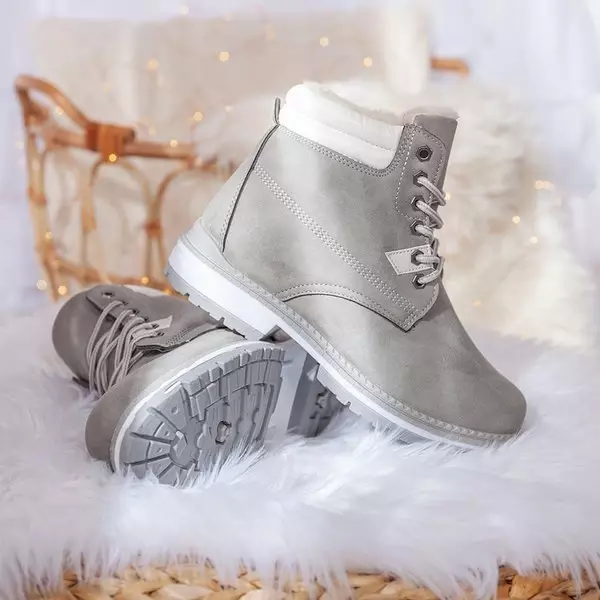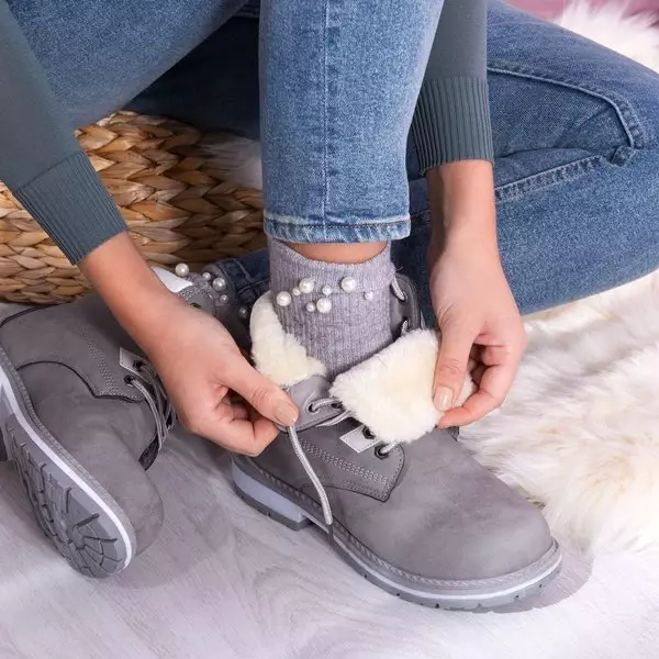 - Meleg fűzős csizma kivágott futófelülettel. Anyaga matt ökobőr, szürke színben. A lábbelit kellemes tapintású szőrzet szigeteli. Megjegyzés: a termék anyaga elszíneződött.