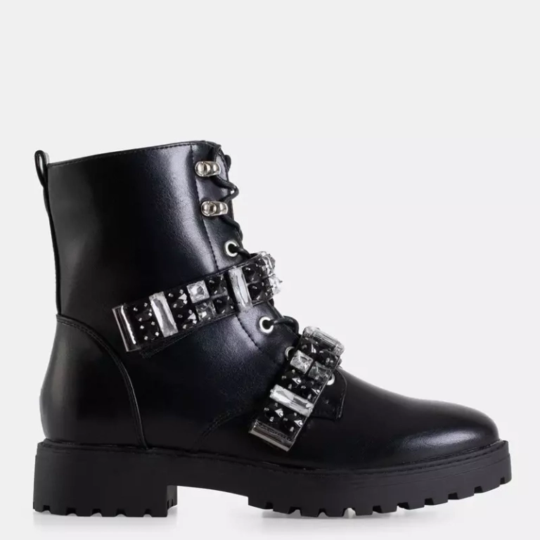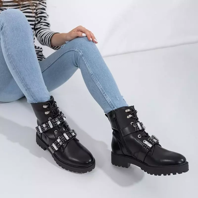 • Szenzációs női lapos sarkú bokacsizma ökológiai bőrből. A modell kristályokkal díszített, cipzárral és tépőzárral rögzíthető, és fűzővel van megkötve. Belül szőrmével szigetelt csizma. Megjegyzés: Néhány dekoráció hiányzik a termékből.