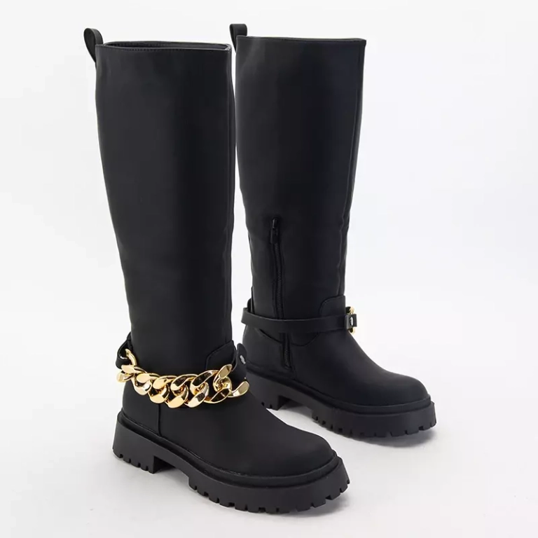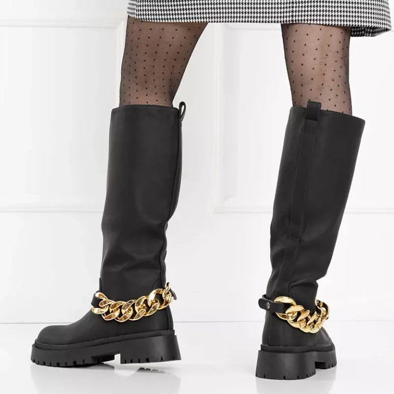 - Női lábszárközépig érő csizma ökológiai bőrből. Felhúzható és részben cipzáros. Lapos sarkú modell dekoratív vastag lánccal a felső részén. Megjegyzés: Néhány dekoráció hiányzik a termékből.