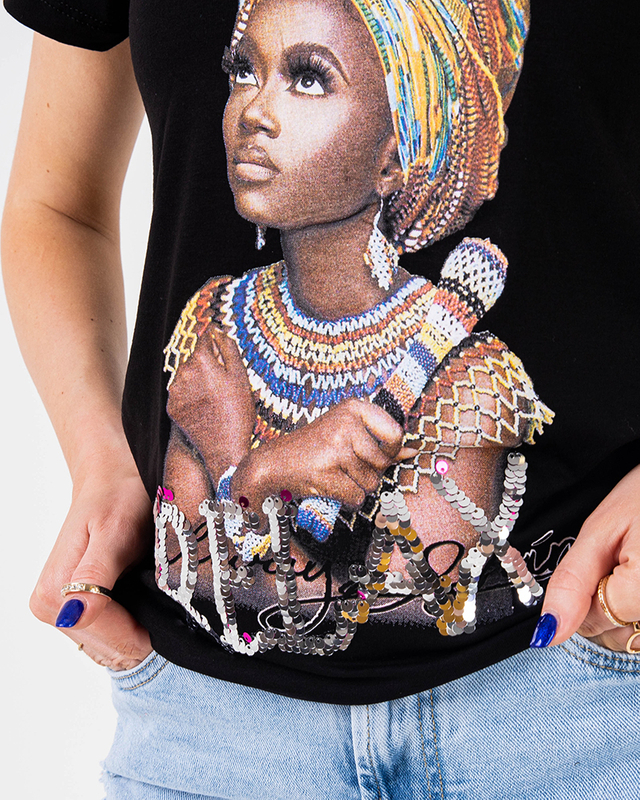 Fekete női póló színes nyomtatással és flitterekkel - Ruházat