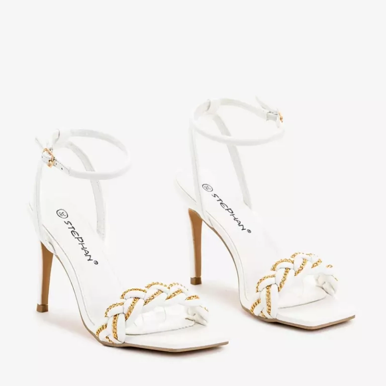 - Gyönyörű női szandál magas sarkon, arany lánccal díszítve. A pár teljes egészében ökológiai bőrből készült. A boka körül csattal rögzíthető állítható pánt található. Megjegyzés: a termék anyaga törött.