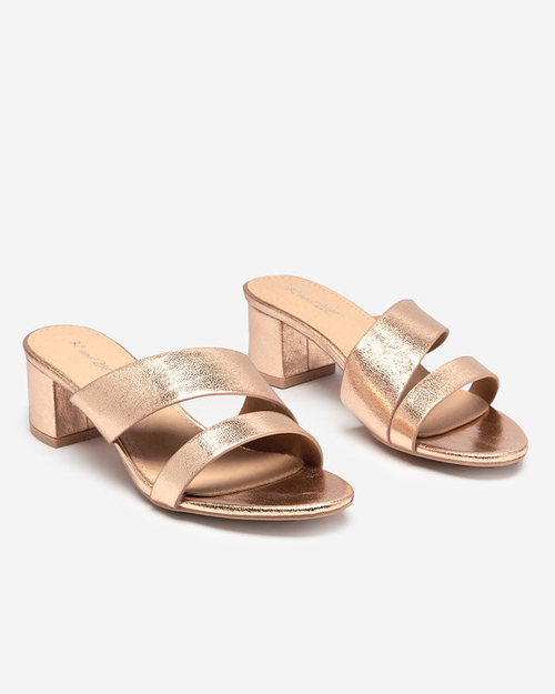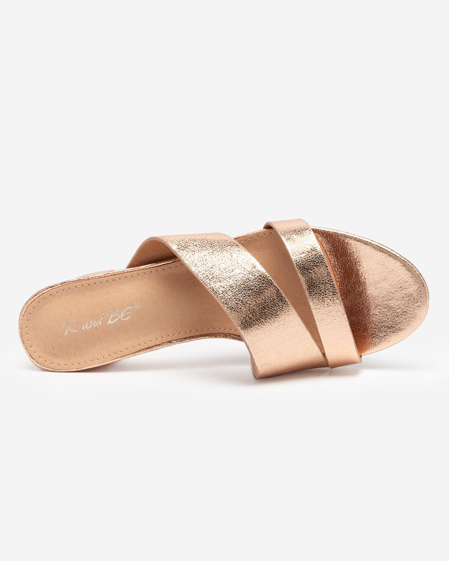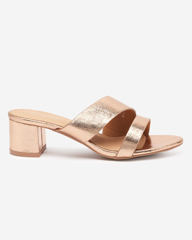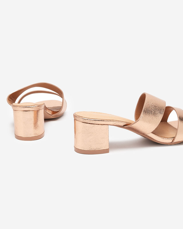 - Gyönyörű női szandál ökológiai bőrből. Gyönyörű arany-rózsaszín színű modell. A papucsok alacsony sarkúak. Eredeti lábbeli, amely sok stílushoz passzol!