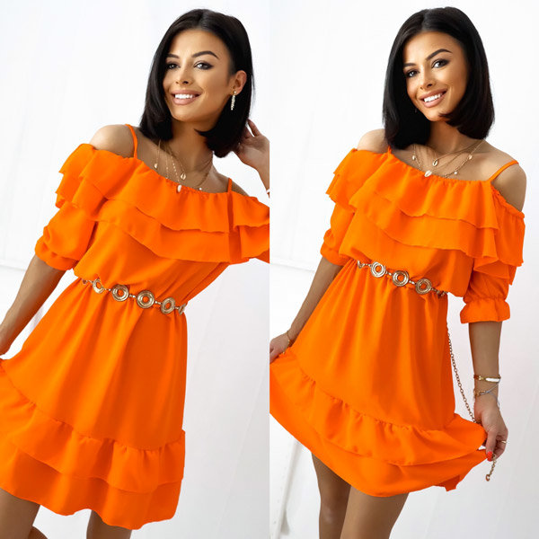 - Gyönyörű női ruha, térd felett, poliészter anyagból. A modell nyakkivágásánál és derékrészénél gumiszalaggal rendelkezik. 3/4-es ujjak és vállpántok, alul és felül fodros. A tökéletes nyári ruha! MEGJEGYZÉS: A mérési pontosság (+/-) 1 cm.