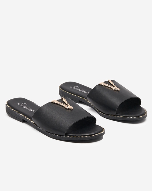 • Elegáns női papucs fekete színben, ökológiai bőrből. Modell arany díszítéssel a pánton és a talp szélén. Nyári ruhákhoz tökéletes! MEGJEGYZÉS: a modell gumitalpon ragasztónyomok lehetnek.