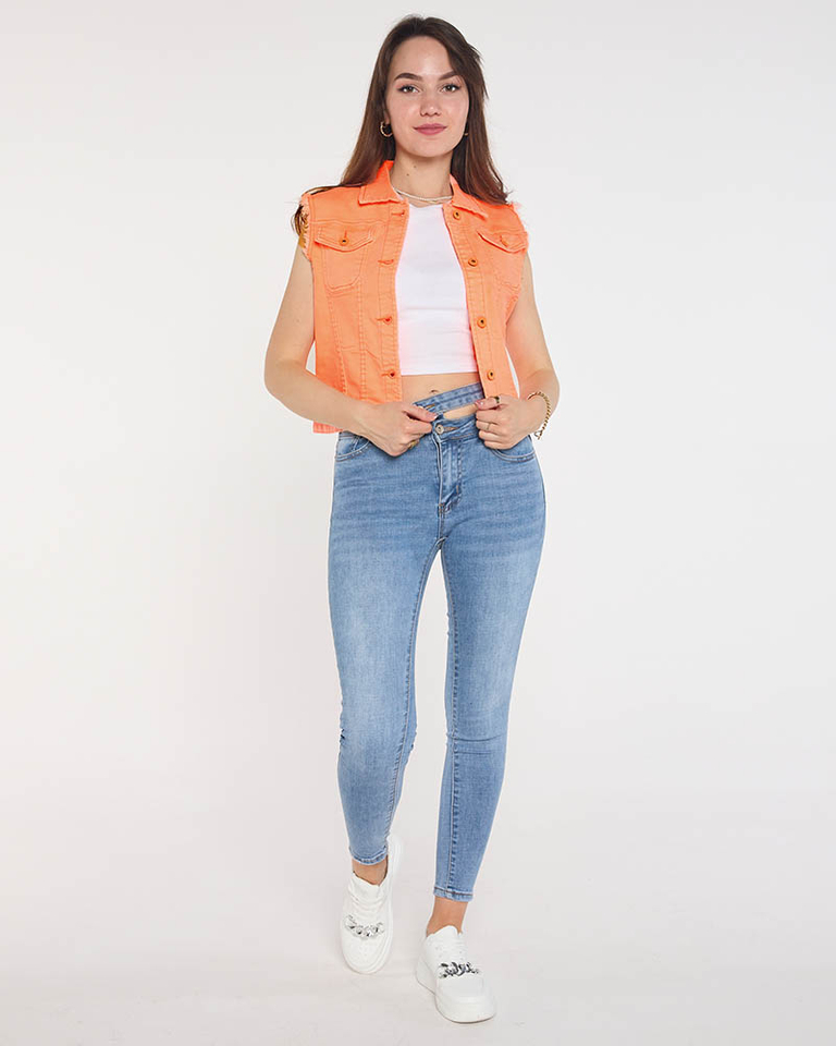 • Ujjatlan farmermellény érdekes árnyalatban. A modell fém gombokkal, gallérral és elöl két füles zsebbel van rögzítve. MEGJEGYZÉS: A mérési pontosság (+/-) 1 cm.