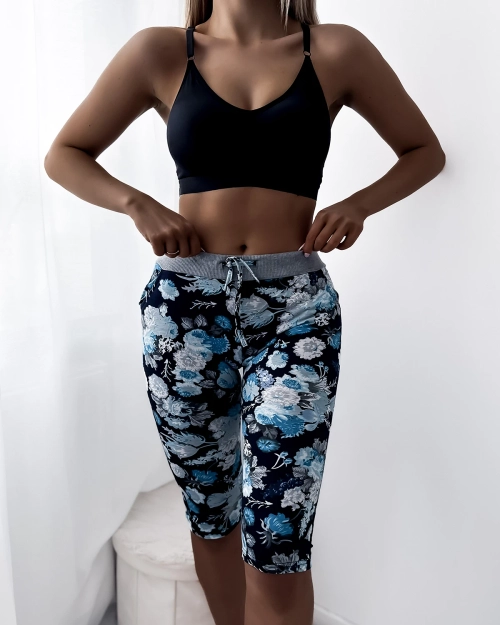 Sötétkék női 3/4 hosszúságú virágmintás rövidnadrág - Ruházat